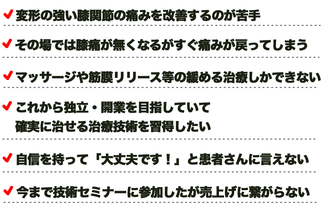 いろんな治療技術を学んでも不安が消えない先生は、今回の動画をきっかけに自信を持って膝痛治療に当たれるようになっていただきたいと思っています。