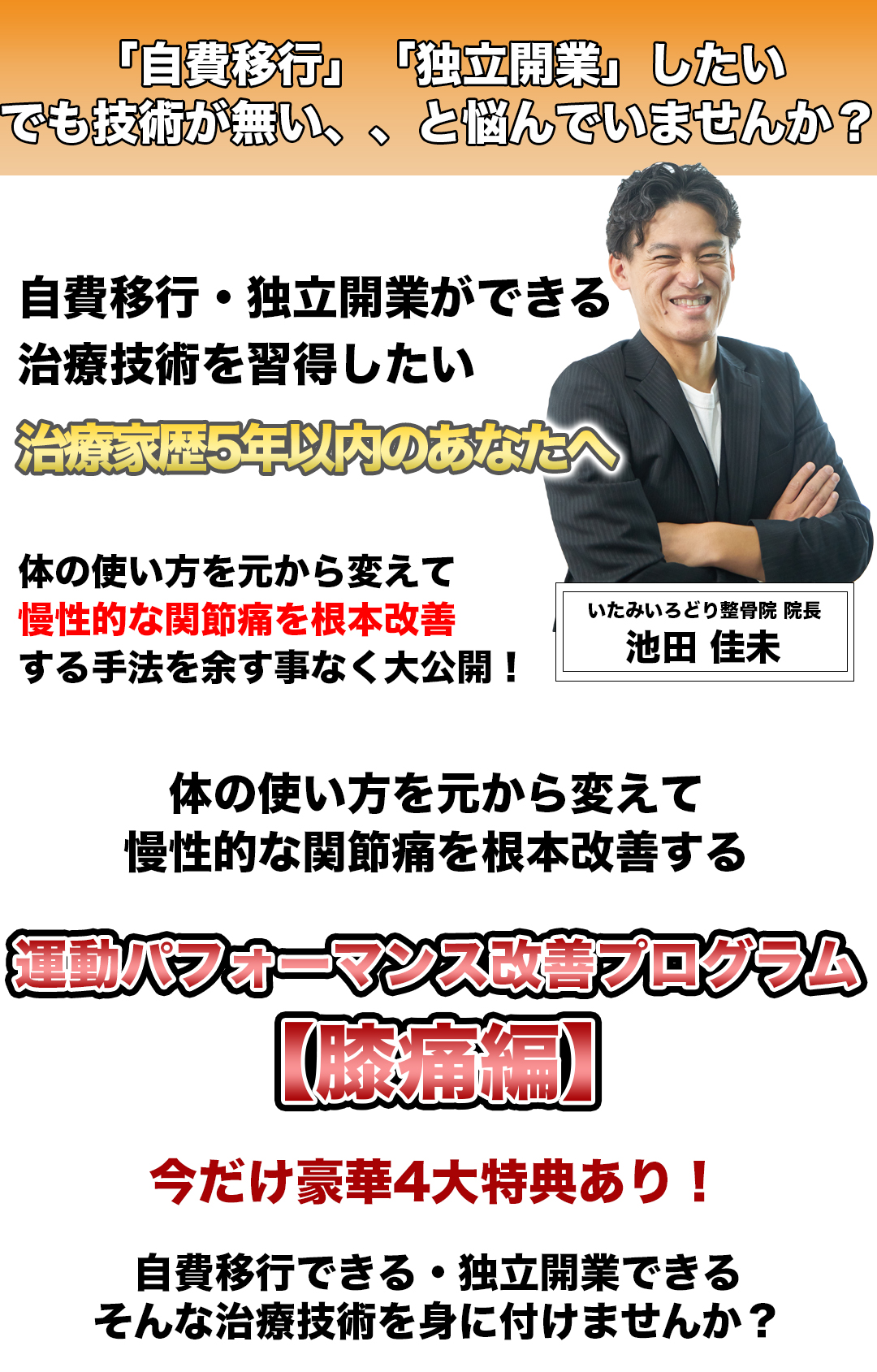 一時は閉院も考えるが、もう一度治療技術と知識を整理し直し、膝痛に特化した治療技術を体系化。