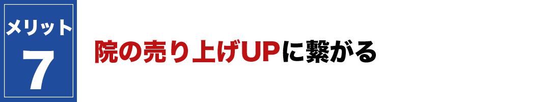 治療の改善率が上がると言うことは来客数の向上にも繋がり、結果として先生の院の売り上げUPにも直結します。